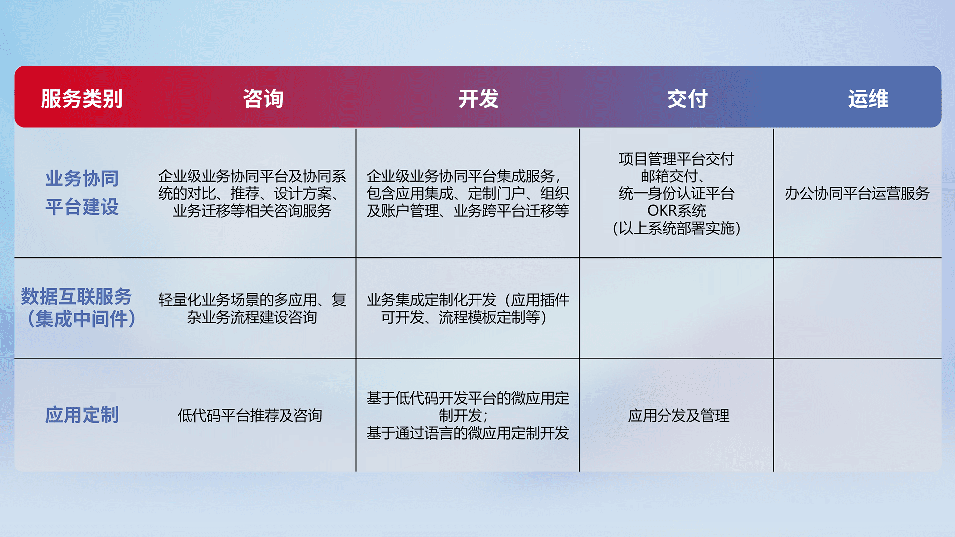 针对钉钉、、、企微、、IDaas等平台级产品提供产品的规划、、方案、、、交付、、定制化开发等服务,,实现如统一协同办公、、、智能客户服务、、、混合会议管理、、、智能数据查询、、、、等业务场景,,,实现数字化转型。。。