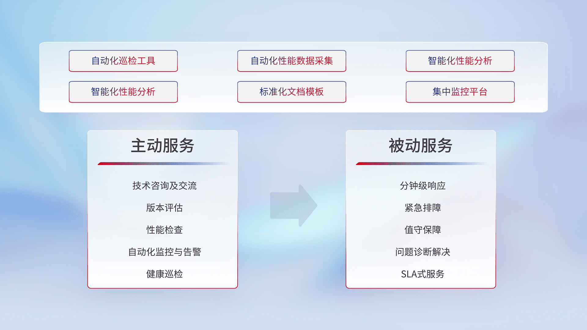 智能化工具和标准化文档,,,保障服务质量,,提供主动服务(包含技术咨询、、版本评估、、性能检查、、、自动化监控与告警、、健康巡检)和被动服务包含(分钟级响应、、紧急排障、、值守保障、、、问题诊断解决、、SLA服务)。。
